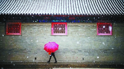 昨天,雪中一位行人打着红伞走在西单附近的胡同里,别有一番情趣。记者 方非摄