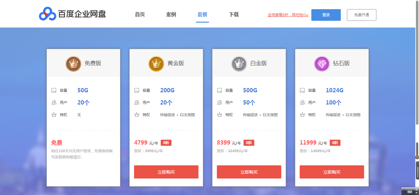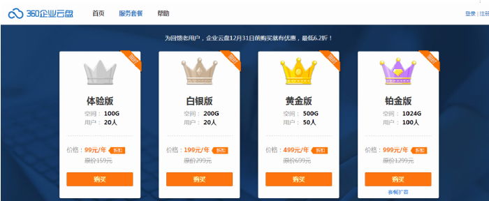 首先,两个产品都就费用、空间等方面对用户做了级别划分。不过从具体数据上看,360企业云盘的划分显然更加合理。一共四个级别的设置,价格从99元/年到999元/年。而同样是四个级别,百度企业网盘每个级别的价格差竟然高达数千元。