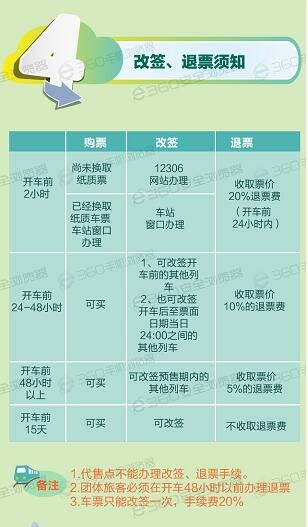 其中,代售点不能办理改签、退票手续,团队旅客必须在开车48小时以内办理退票,车票只能改签1次,手续费20%。