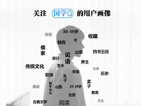 本次大数据也为关注国学用户量身定制了细致到颗粒度的用户画像。画像显示,阅读国学相关资讯的用户大多集中于生活在历史古都的30-39岁的男性,除关注论语、传统文化、典故等国学内容外,也会阅读收藏、文学、艺术等有品的资讯内容。这也侧面反映出关注国学资讯内容的用户无论是知识结构还是兴趣储备方面,都已具备较高的水平。