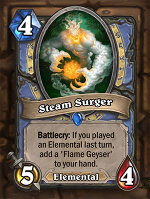 (元素)战吼:如果你上回合打出过元素,则将一张“烈焰喷涌”加入你的手牌(烈焰喷涌是2费打2,给你一张1/2元素的法师法术)