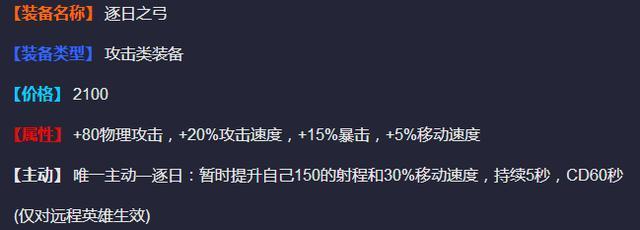 从面板属性上来看:攻击力加成、攻速加成、暴击、移速几乎都是对射手提升极大的属性,而更加逆天的属性就是它的主动技能,作为为数不多的射手主动技能,150码的射程和30%的移速加成,无疑是一个强力发动机,最大限度的发挥射手在大后期的输出,因为对于后期神装对拼来说,射程就是最大的优势。无论是高地僵持点塔还是野区单挑,这件装备毫无疑问都是一件神器。