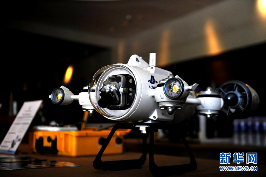 在上海浦东临港展示的“白鲨”系列水下无人机(7月11日摄)。7月11日,上海临港举办第一届上海海洋智能装备高峰论坛,并展示了多种海洋智能装备。(新华社记者 张建松 摄)