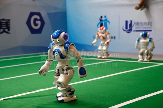 8月25日,2017世界机器人大会上,机器人接力赛吸引了观众的目光。(来源:中新社 记者:刘关关)