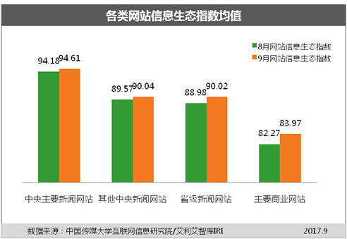 新华网北京10月11日电(韩家慧)中国传媒大学互联网信息研究院11日发布的《网站信息生态指数2017年9月榜》显示,网站信息生态指数均值较上月有所提升,中央主要新闻网站生态优,内容安全保障程度高,其他各指标表现均衡;其他中央新闻网站总体生态好,信息生产传播与创新方面还可提高;省级新闻网站总体生态较好,用户管理、响应度方面还需加强;主要商业网站生态良,总体还需进一步加强,尤其需要加强内容审核。