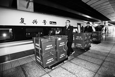 昨天,北京南站“高铁极速达”快递服务试运行,工作人员将快递推上高铁列车。