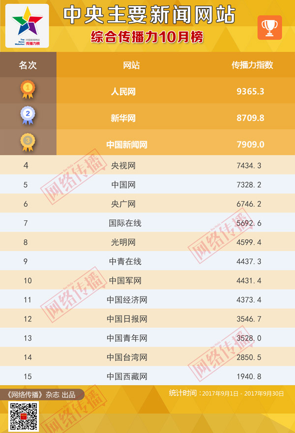 中央网信办《网络传播》杂志倾力打造的“中央主要新闻网站传播力2017年10月榜”今日发布。