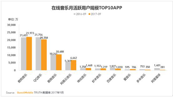 其次,衡量流量的另一个关键词就是“用户活跃率”。据了解,2017年1月以来,在线音乐应用移动端行业月活用户规模仅保持在5.6亿以上,此时的用户活跃率就显得尤为重要。值得注意的是,在这5.6亿月活中,酷狗音乐APP移动客户端的保守月活就占到了2.17亿。尤其是在近日QuestMobile提供的2017三季度在线音乐应用的成绩单中,酷狗音乐一如既往蝉联“N连冠”,充
