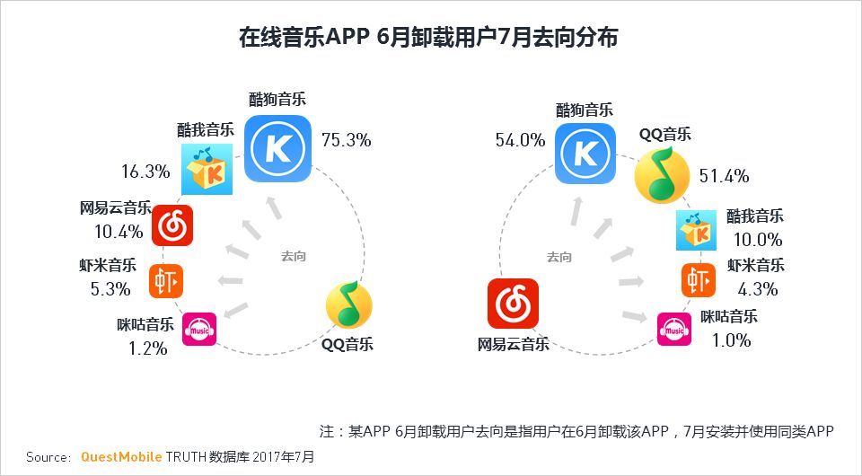 当然,除了“用户活跃率”之外,在线音乐平台“用户卸载去向分布”也值得推敲。