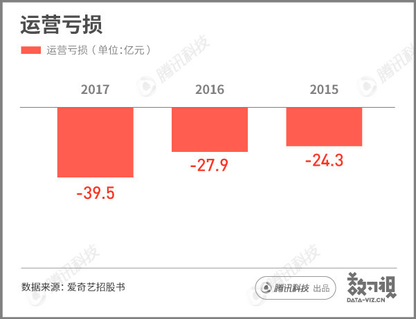 爱奇艺2017年运营亏损为人民币39.530亿元(约合6.076亿美元),2016年运营亏损为人民币27.895亿元,2015年运营亏损为人民币24.276亿元。