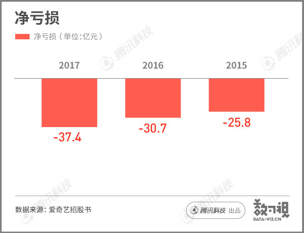 爱奇艺2017年净亏损为人民币37.369亿元(约合5.755亿美元),2016年净亏损为人民币30.740亿元,2015年净亏损为人民币25.751亿元。