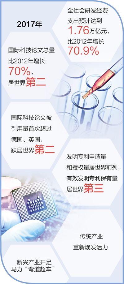 数据显示,2017年,全社会研发经费支出预计达到1.76万亿元,比2012年增长70.9%。国际科技论文总量比2012年增长70%,居世界第二;国际科技论文被引用量首次超过德国、英国,跃居世界第二。发明专利申请量和授权量居世界前列,有效发明专利保有量居世界第三。我国已成为具有全球影响力的科技大国、创新大国。创新驱动发展成果丰硕。