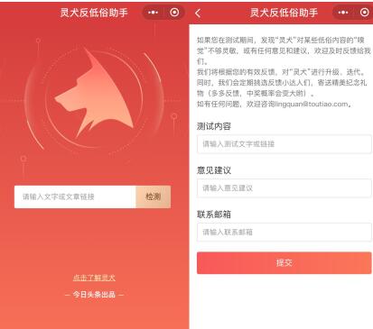 这是“灵犬”上线以来,第一次大规模更新。“灵犬”于2018年4月8日正式上线,是国内首款人工智能反低俗小程序。“灵犬”只需要一段文字或文章链接,就能检测内容健康指数,并返回鉴定结果,包括:是否可以获得算法推荐,是否需要引入人工判断等。对于用户输入的内容,“灵犬”会先进行提取、分词和语义识别,然后根据算法规则,输出对应的分数、评级和结论。这一切,都在短短几秒内完成。