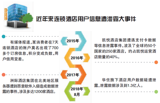 2015年,7天连锁酒店也卷入到用户信息安全事件中。据报道,当时有市民的7天连锁酒店账户,在不到两个月的时间里,莫名出现了700多个订房信息,积分变成负数,用户信用变得极差。此后在2016年,凯悦酒店集团也曾遭遇了支付卡数据等信息泄露事件,且波及了全球约50个国家的250家酒店,约占凯悦运营酒店数量的40%,其中中国有22家凯悦集团旗下酒店被波及。泄露的信息包括住客支付卡姓名、卡号、到期日期和验证码。
