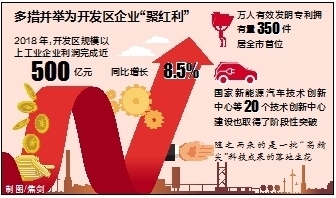 多措并举为开发区企业“聚红利”收到了实效:2018年,开发区规模以上工业企业利润完成近500亿元,同比增长8.5%,万人有效发明专利拥有量350件,居全市首位。国家新能源汽车技术创新中心等20个技术创新中心建设也取得了阶段性突破,随之而来的是一批“高精尖”科技成果的落地生花。