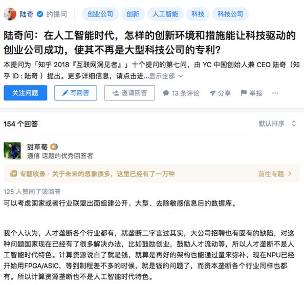 去年10月,陆奇在知乎发起提问,“在人工智能时代,怎样的创新环境和措施能让科技驱动的创业公司成功,使其不再是大型科技公司的专利?“值得一提的是,此次提问是陆奇选择加入YC中国之后的首次选择在第三方平台对外发声。