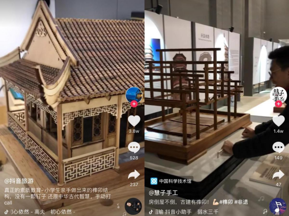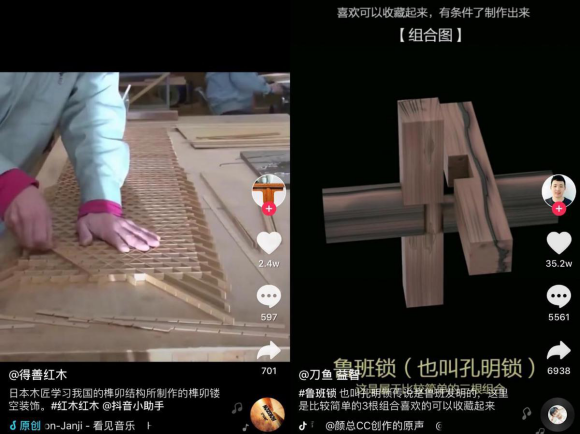进入短视频时代,抖音已成为人们获取资讯的重要平台。通过生活实拍,抖音上的传承人还原了榫卯技艺,勾起了大家对非遗文化的情怀,让更多人看到了这门古老的技艺,也重新唤起了大家对传统技艺的自信心。