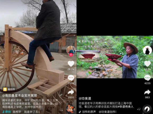 像榫卯这样的非遗技艺在抖音上还有很多。据统计,1372个国家级非遗项目中,抖音上涵盖了1214项,覆盖率达到88.48%。抖音目前已经是国内最大的非遗传播平台。