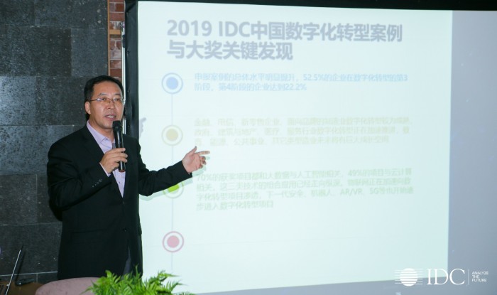 IDC中国副总裁兼首席分析师武连峰先生在会上表示: “2019 IDC中国数字化转型大奖申报案例的总体水平明显提升,52.5%的企业在数字化转型的第3阶段,第4阶段的企业达到22.2%。从行业角度看,金融、电信、新零售企业、面向品牌的制造业数字化转型较为成熟,政府、建筑与地产、医疗、服务行业数字化转型正在加速推进,教育、能源、公共事业、其它类型造业未来将有巨大成长空间。从技术角度看,70%的获奖项目都和大数据与人工智能相关,49%的项目与云计算相关,这三类技术的组合应用已经走向纵深。物联网正在加速向数字化转型项目渗透,下一代安全、机器人、AR/VR、5G等也开始逐步进入数字化转型项目。从转型领域角度看,领导力转型(未来文化)、信息与数据转型(未来智能)、全方位体验转型(未来客户)明显加速,人力资源转型(未来工作)、运营模式转型(未来运营)与全球比仍有一定差距。”