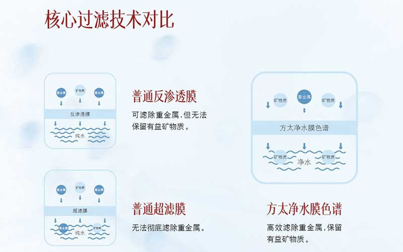 当下,能够对原水进行净化处理的主流技术有超滤、反渗透及纳滤三种。其中,超滤技术可以对水质进行粗过滤,能够去除泥沙等大颗粒杂质,但去除不了重金属等有害物质,适用于水质较好的地区;反渗透技术几乎过滤掉水中的所有物质,包括对人体有益的矿物元素,出水几乎为纯水,属于过度过滤。纯水没有营养,呈酸性且溶解性强,易造成体内原有矿物元素流失,造成人体脱矿,不适合快速生长发育的少年儿童作为日常饮水长期饮用;纳滤技术则规避了前二种技术的弊端,既有效去除水中的有害物质,又保留人体所需矿物元素,保障饮水的安全健康性。