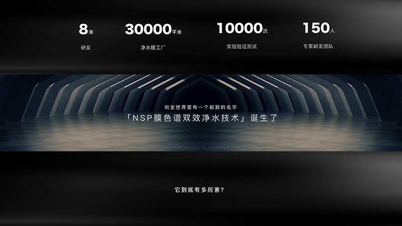 从2012年开始,方太组建了50人研发团队,投资近5000万元,建成了近1600平米的中试研发工厂及2个专业净水实验室。经过25个全国优质水源地和典型水质城市的调研,100多种核心技术材料选型验证,400名极客用户参与联合验证研发,1000次溶出物冲洗实验,3000种膜配方实验,10000次实验验证测试,方太NSP膜色谱双效净水技术,终于实现了从理论到实践,从实验室到产业化的跨越式发展。