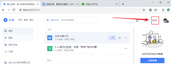 为了给用户提供更加便捷的使用体验,使用WPS表单时无需下载多余的组件和APP,电脑端可在金山文档网页(在线协作工具)中,点击右上角的【表单】即可使用;或者也可以在WPS Office 2019电脑客户端中,在新建文件时选择表单即可。