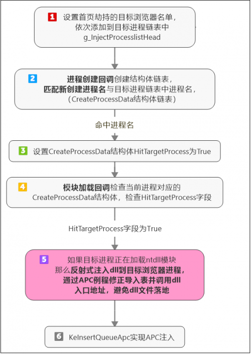 利用进程创建回调和模块加载回调在目标浏览器进程创建时通过插APC的方式将劫持首页的动态库注入到目标进程中,各回调机制之间的关系如下: