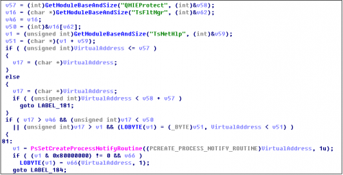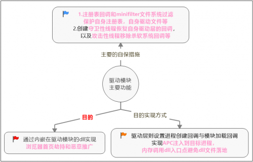 木马驱动模块注册的系统回调主要包括:进程创建回调,模块加载回调,注册表回调,minifilter文件系统过滤四个部分。其中进程创建回调和模块加载回调两部分是为了让木马顺利完成APC注入浏览器首页劫持;注册表回调则是保护自身注册表不被杀毒软件访问,进而在目标电脑长驱直入;最后的minifilter文件系统,则是保护自身驱动文件拒绝浏览器加载指定安全模块,进一步防范目标电脑的安全拦截。