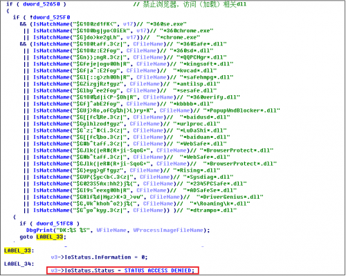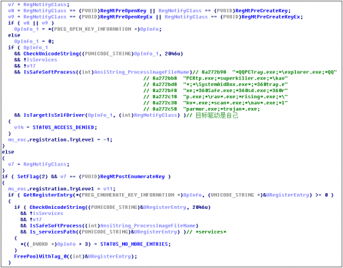 注册表回调用于阻止杀毒软件等进程对病毒注册表的访问,以保护自身,代码逻辑如下: