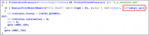 如果当前访问目标为驱动本体,则使用IoReplaceFileObject将文件重定位到acpi.sys: