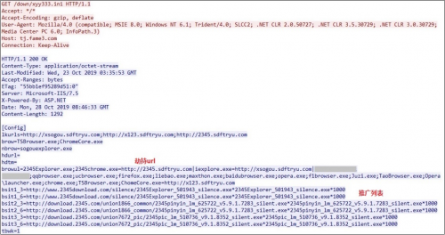 注入目标进程的动态库,会请求一份云控配置文件,其中就包含要劫持浏览器主页的配置和要静默推广的软件列表: