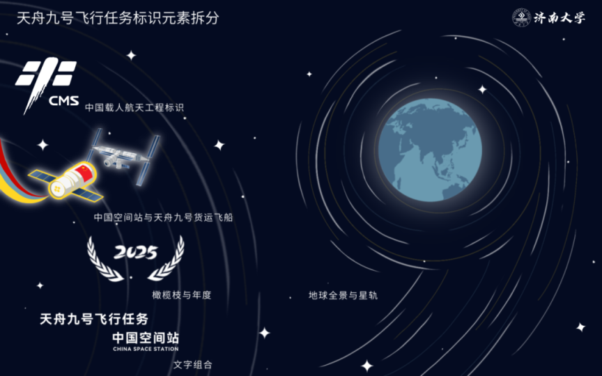 设计者孙建栋:此次天舟九号飞行任务标识最终入围并被采用,我感到无比荣幸。这不仅是对我个人艺术设计理念与专业能力的高度认可,更是我作为一名高校教师,用视觉语言参与国家重大工程文化表达的珍贵机会。能以所学所长服务中国航天事业,是对我多年教学与研究工作的最好肯定。此次设计工作由我和我的学生姚佳共同完成,是济南大学坚持“以文化涵养初心、以创新实践服务国家”育人理念的生动体现,也是我校服务国家战略、践行育人初心的具体实践。能为中国载人航天事业贡献一份创意力量,是我和所有济大人引以为傲的光荣时刻。