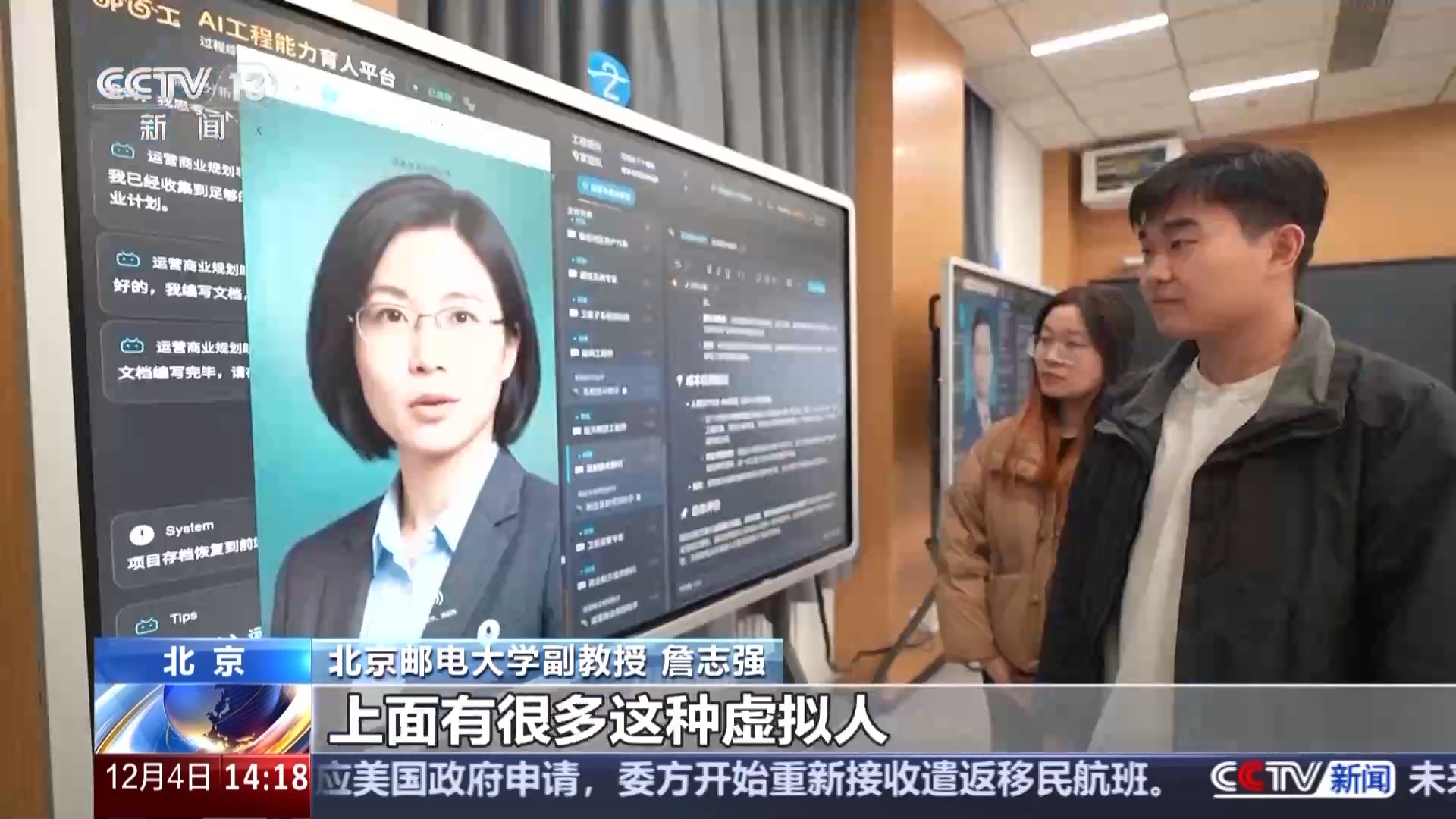 北京邮电大学副教授 詹志强:开发了“邮百工”平台,上面有很多这种虚拟人,虚拟人后边,老师要把相关的知识、教案、课程资源把它放进去,这个工程会碰到什么问题,已经把它预设在里边,学生做了什么样思维的决策,都会被记录到我们的数据库中,作出细致的评价。