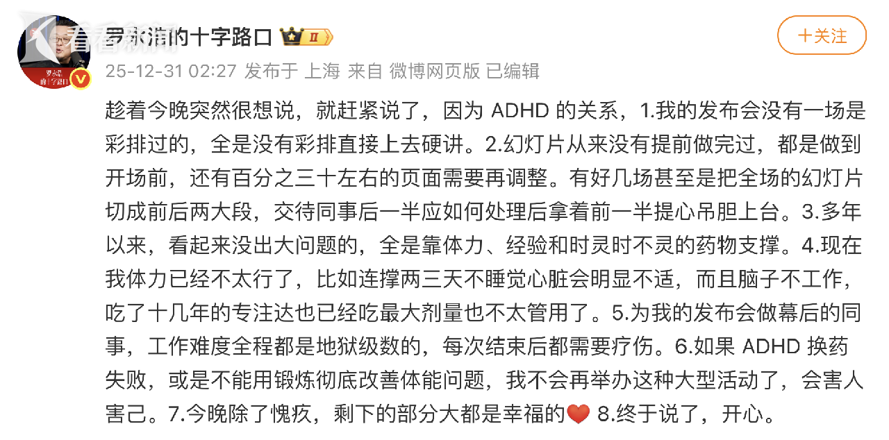 今天(31日)凌晨,罗永浩发文自曝患有ADHD(注意缺陷与多动障碍),并称药物已不太管用计划换药,若不见效将不再举办大型活动害人害己。