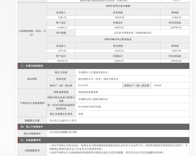 北京产权交易所网站公告的内容显示,本次交易的转让方为中国航天三江集团有限公司。交易完成后,标的企业(即科工火箭)不得再继续使用国家出资企业及其子企业的字号、经营资质和特许经营权等无形资产,不得继续以国家出资企业子企业名义开展经营活动。