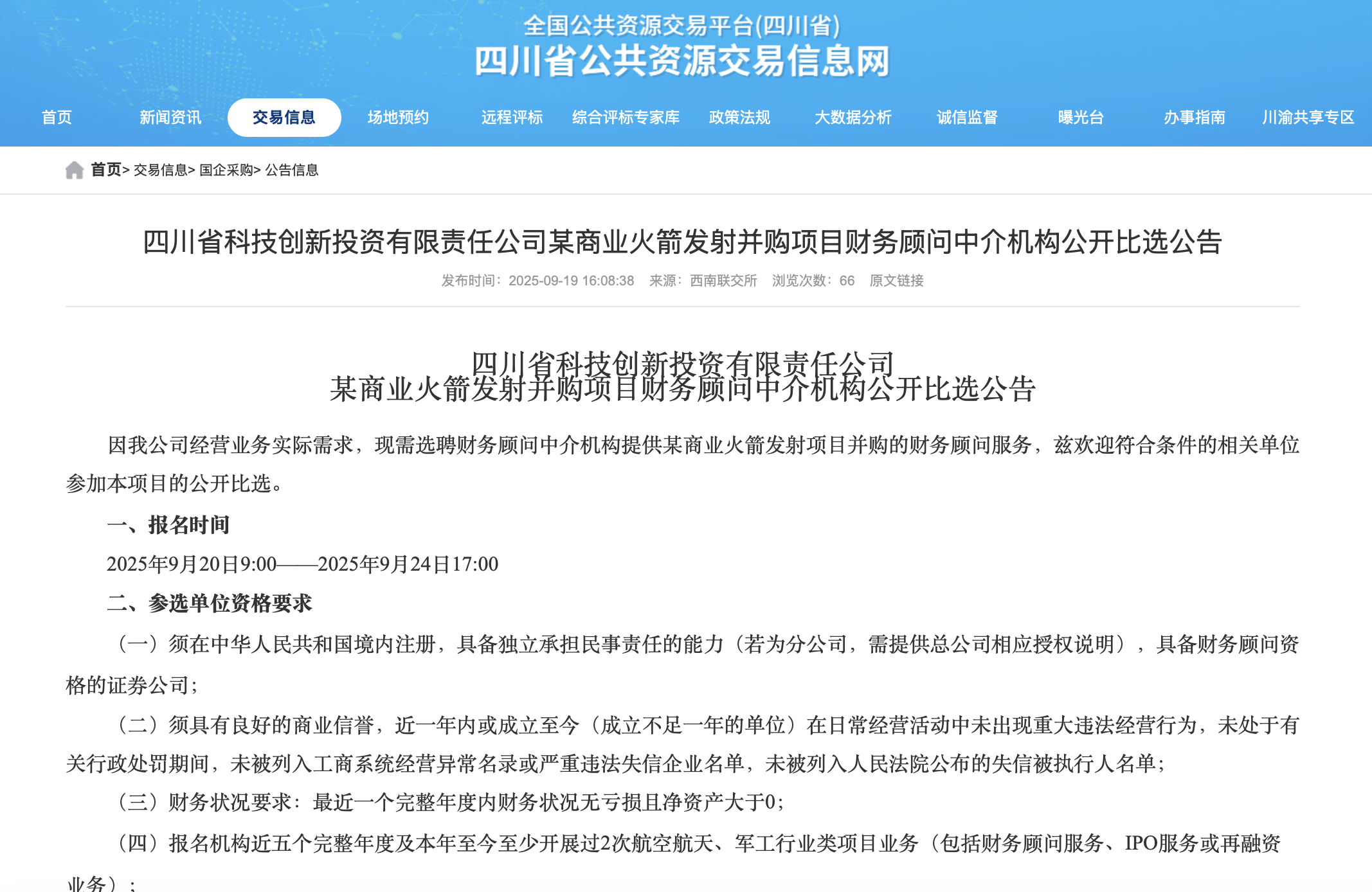 该公告显示,四川省科技创新投资有限责任公司(下称四川科创投)出于经营业务实际需求,现需选聘财务顾问中介机构提供某商业火箭发射项目并购的财务顾问服务。