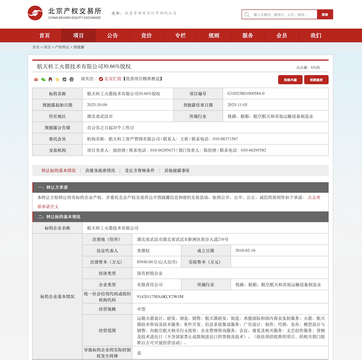 据北京产权交易所近日披露,航天科工火箭技术有限公司(下称科工火箭)正在出售30.66%的股权,预披露日期自10月9日至11月5日。