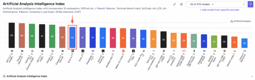 市场的选择印证了其竞争力:在大模型超市OpenRouter上,GLM-4.5/4.6的付费API收入超过所有国产模型总和,稳居全球调用量前十。2025年更具里程碑意义——在Code Arena代码盲测中,GLM-4.6与Claude、GPT-5并列全球第一,首次打破海外模型在顶级评测中的垄断。最新发布的GLM-4.7不仅在Code Arena中位列开源第一,更在AA智能指数综合评测中登顶开源与国产模型双榜首。