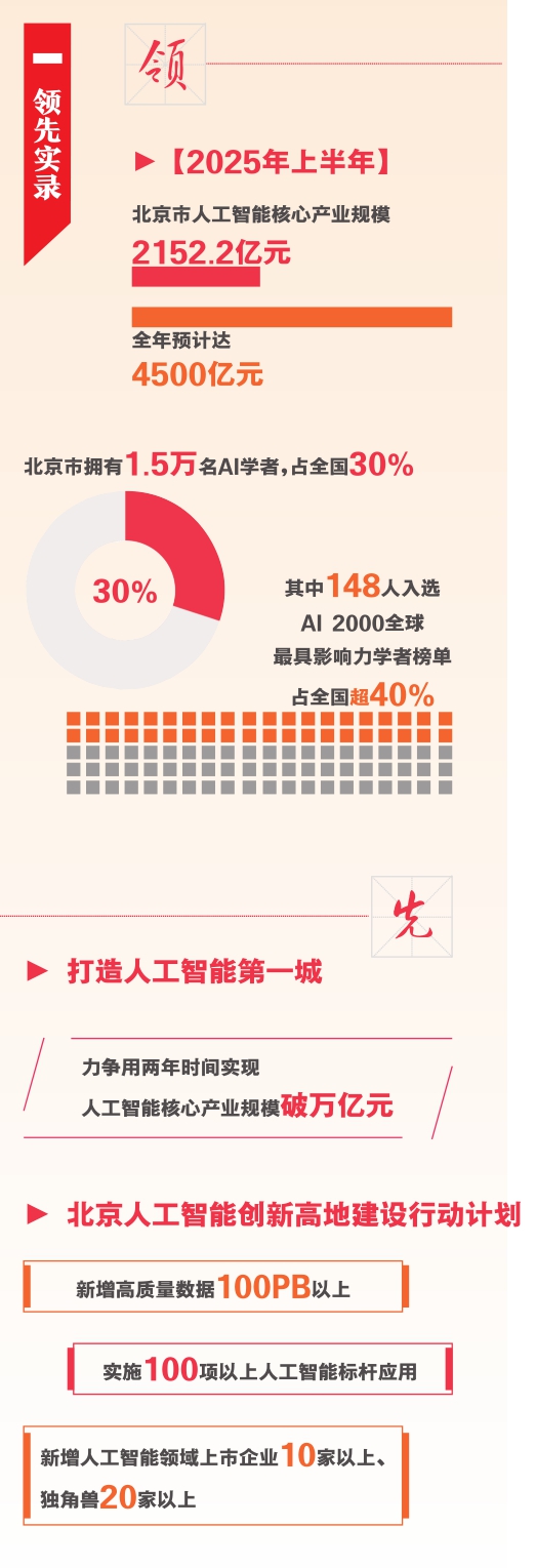 站在“十五五”开局之年,北京打造人工智能第一城的路径愈发清晰:力争用两年时间实现人工智能核心产业规模破万亿元。当全球AI竞争进入“生态协同”新阶段,北京的“领”在于源头创新,“先”在于全链落地——这座城,正从中国AI高地,迈向世界创新策源地。