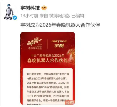还记得去年春晚上那些“扭秧歌”的机器人吗?它们的升级版,即将在马年春晚的舞台上与观众见面。宇树科技日前在社交平台官方宣布,将以“机器人合作伙伴”身份,在北京主会场带来全新表演,但未透露具体内容,令人期待。