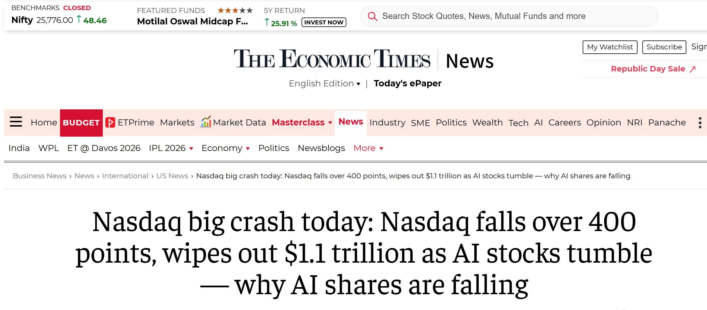 2月5日消息,据The Economic Times报道,近期,全球软件与服务板块遭遇持续抛售,市场波动引发广泛关注。标普 500 软件与服务指数连续六个交易日下跌,自 1 月 28 日以来市值蒸发约 8300 亿美元,较去年 10 月高点回落 26%,本轮累计跌幅接近 13%。这一现象背后,人工智能技术的快速迭代与应用渗透成为核心影响因素。