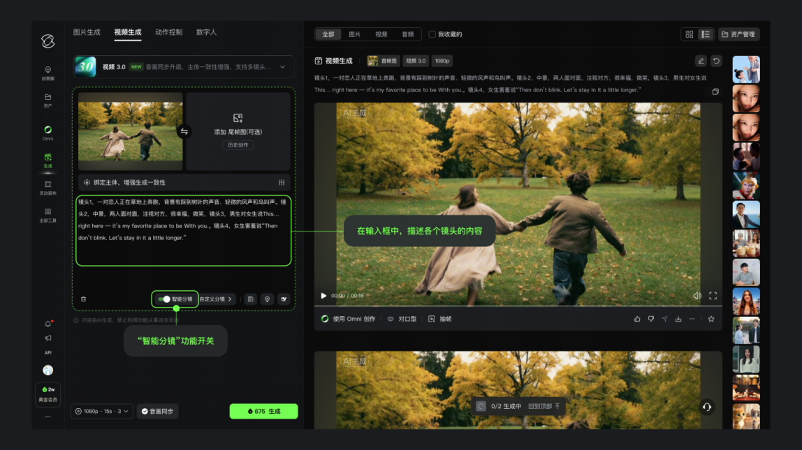 此外,该模型支持最长15秒视频的连续生成,并引入智能分镜与自定义镜头控制,让创作者能够直接组织镜头节奏与叙事结构,不再依赖碎片化拼接,从而让镜头具备情绪递进与画面张力。