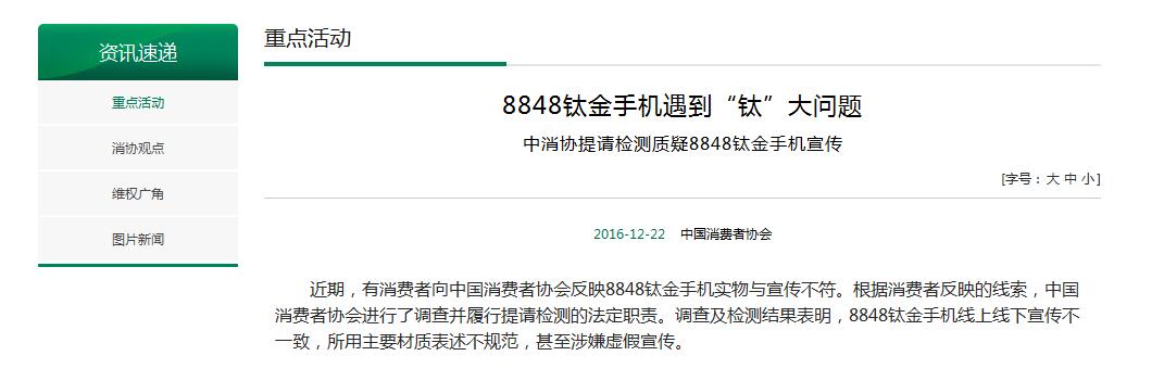 登陆8848钛金手机官网,便可以清晰看到,在手机介绍中,使用“边框采用瑞士名贵腕表所用5系钛合金,硬度与拉强度、耐磨度、防腐蚀性大幅提高,更加加固耐用。”的说法。而中消协表示,经检测,8848钛金手机(巅峰版)的背面金属件中的圆形部分基体为工业纯钛,背面金属件中带刻纹部分材质相当于国产TC4钛合金。可见官网的产品材料介绍明显失实。
